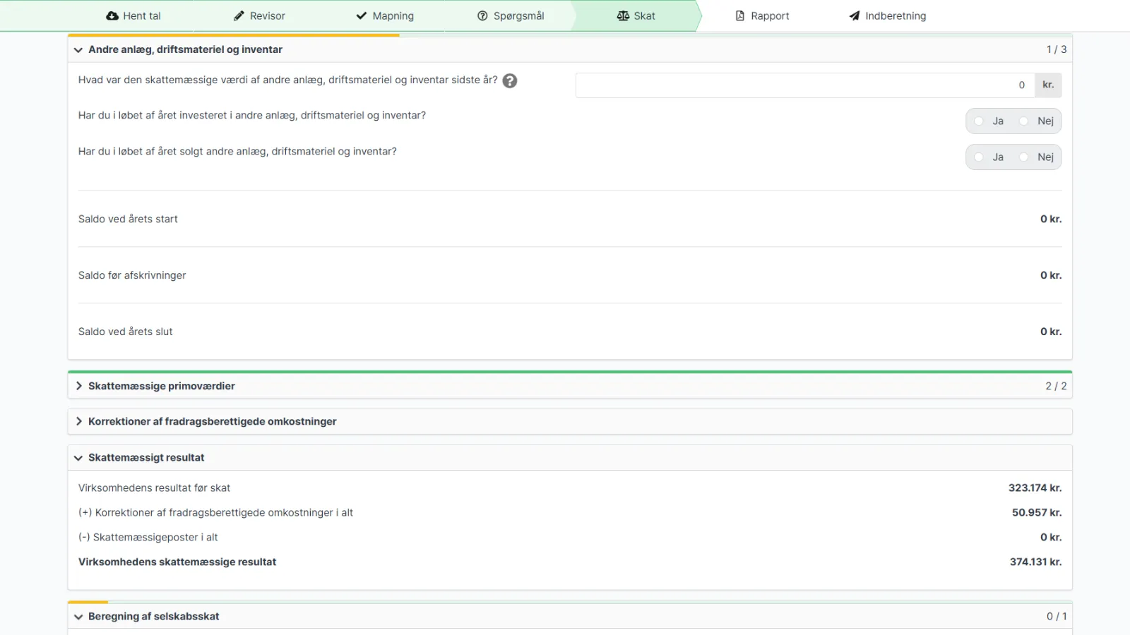 Værktøjet hjælper dig med at holde styr på de skattemæssige afskrivninger og korrektioner af fradrag. Udover det beregnes skatten, udskudt skat og udbytteskat automatisk, som værktøjet også tilbyder at bogføre automatisk for dig.