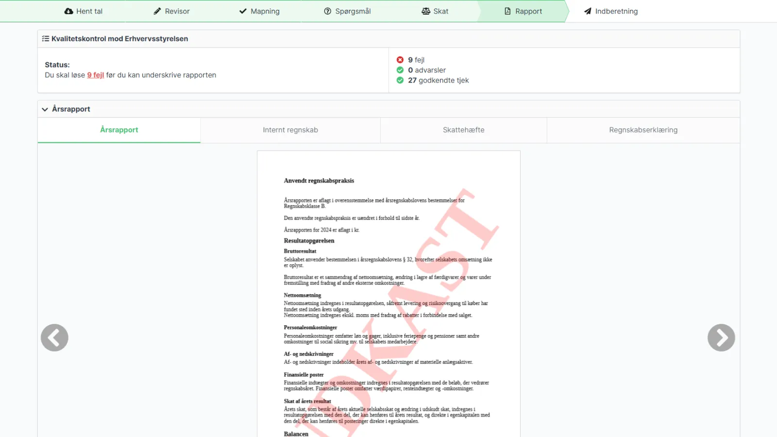 Du har nu et skattehæfte samt en komplet årsrapport i en ekstern og intern version. Rapporten bliver vist sammen med en tjekliste, der viser, om dataene matcher de lovmæssige krav.