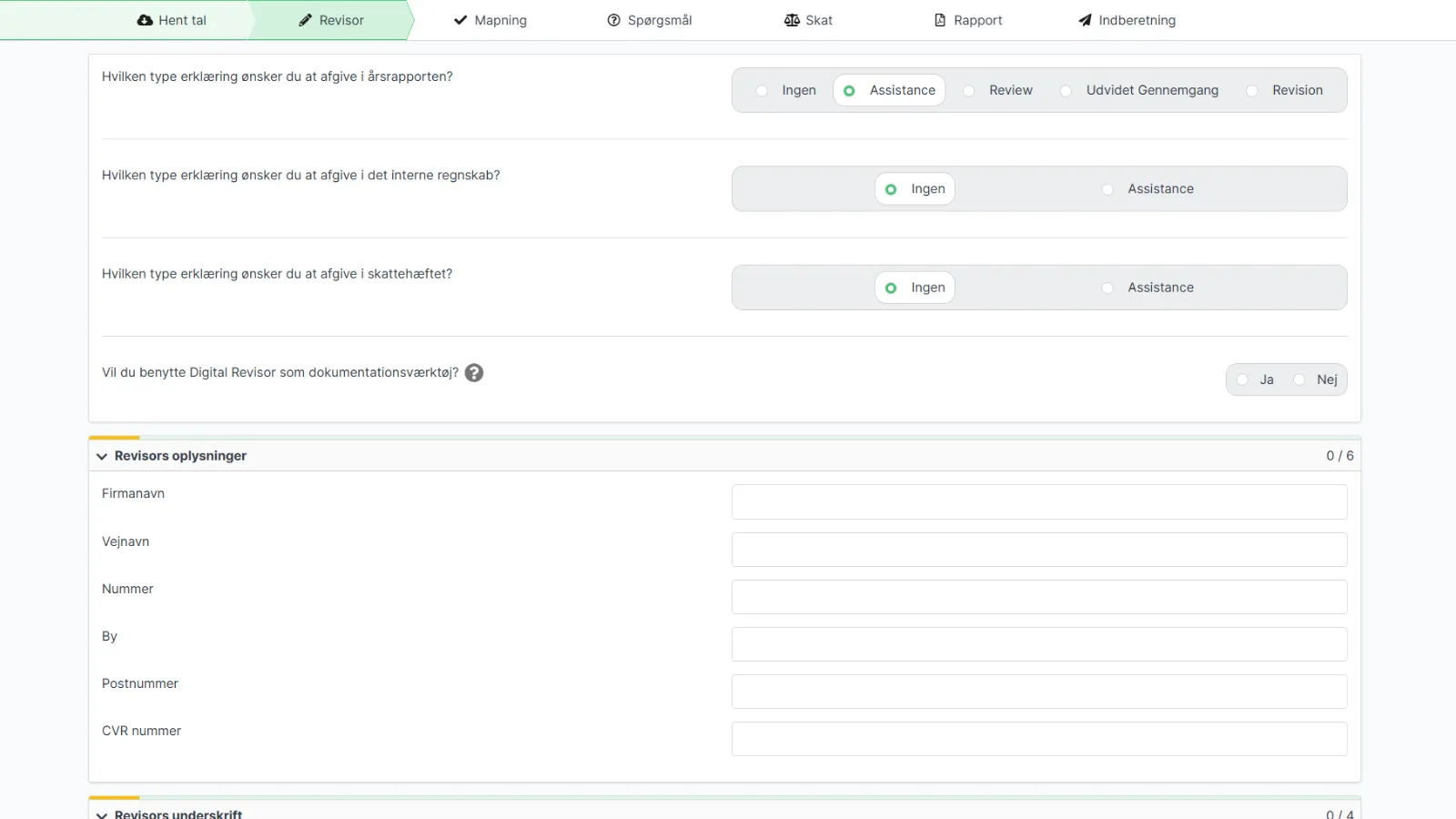 Her kan du tilføje erklæring på årsrapporten samt dokumentation for din proces. Vælg mellem asistance, review, udvidet gennemgang eller revision og angiv hvilken godkendt revisor, der skal underskrive. Erklæringerne er baseret på FSR-standarder.