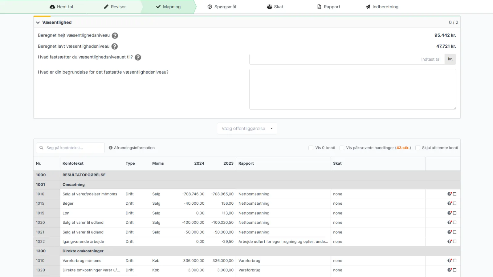 Når tallene er hentet, mapper maskinlæringsalgoritmen automatisk din klients kontoplan op mod skemakravene i Årsregnskabsloven. Her kan du tilpasse opmapning og afstemme konti, tilføje efterposteringer og uploade bilag.